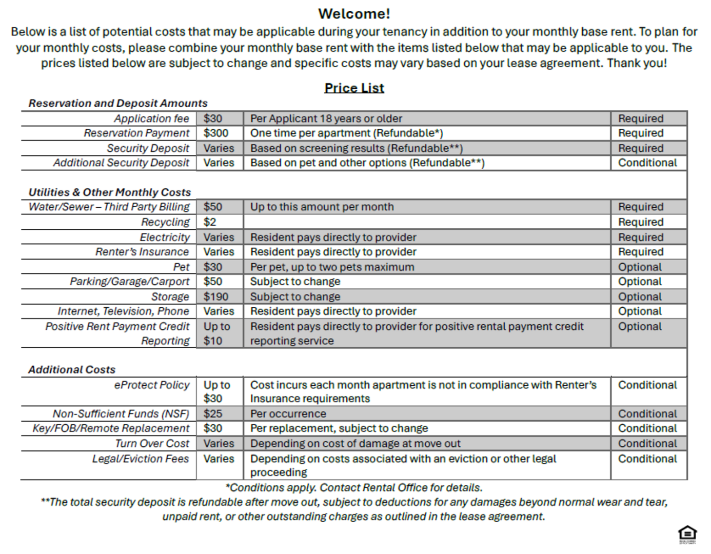 Price shown is Base Rent. Residents are required to pay the following: Application Fee ($30.00 Per Applicant 18 years or older, One-Time, At Application), Reservation Payment ($300, One time per apartment, Refundable*), Security Deposit (Varies, Based on screening results, Per Apartment, Refundable**), Additional Security Deposit (Varies, Based on pet and other options, Refundable**, Water/Sewer (Up to $55 per month per apartment, Utility, Usage Based, Nonrefundable), Recycling ($2 per month per apartment, if applicable, Nonrefundable), Electricity/Gas (Varies, Usage Based, Utility, Resident pays directly to provider), Renter’s Insurance (Varies, Resident pays directly to provider). Optional charges that may be applicable to the resident are as follows: Pet ($30 Per pet per month, Up to two pets maximum, Nonrefundable), Parking/Carport/Garage/Storage (Varies per property, per month, Subject to change, Nonrefundable, Refundable** deposit may apply), Internet, TV, Phone (Varies, Utility, Resident pays directly to provider), eProtect Policy (Up to $30, Cost incurs each month apartment is not in compliance with Renter’s Insurance requirements, Nonrefundable), Non-Sufficient Funds (NSF) ($25 Per occurrence, Nonrefundable) Key/FOB/Remote Replacement (Varies per property, Per replacement, Subject to change, Nonrefundable), Positive Rental Payment Credit Reporting ($2.00 per month per resident, Resident pays directly to CredHub, Nonrefundable), Turn Over Cost (Varies, Depending on cost of damage at move out), Legal/Eviction Fees (Varies, Depending on costs associated with an eviction or other legal proceeding). *Conditions apply. Contact Rental Office for details. **The total security deposit is refundable after move out, subject to deductions for any damages beyond normal wear and tear, unpaid rent, or other outstanding charges as outlined in the lease agreement.
